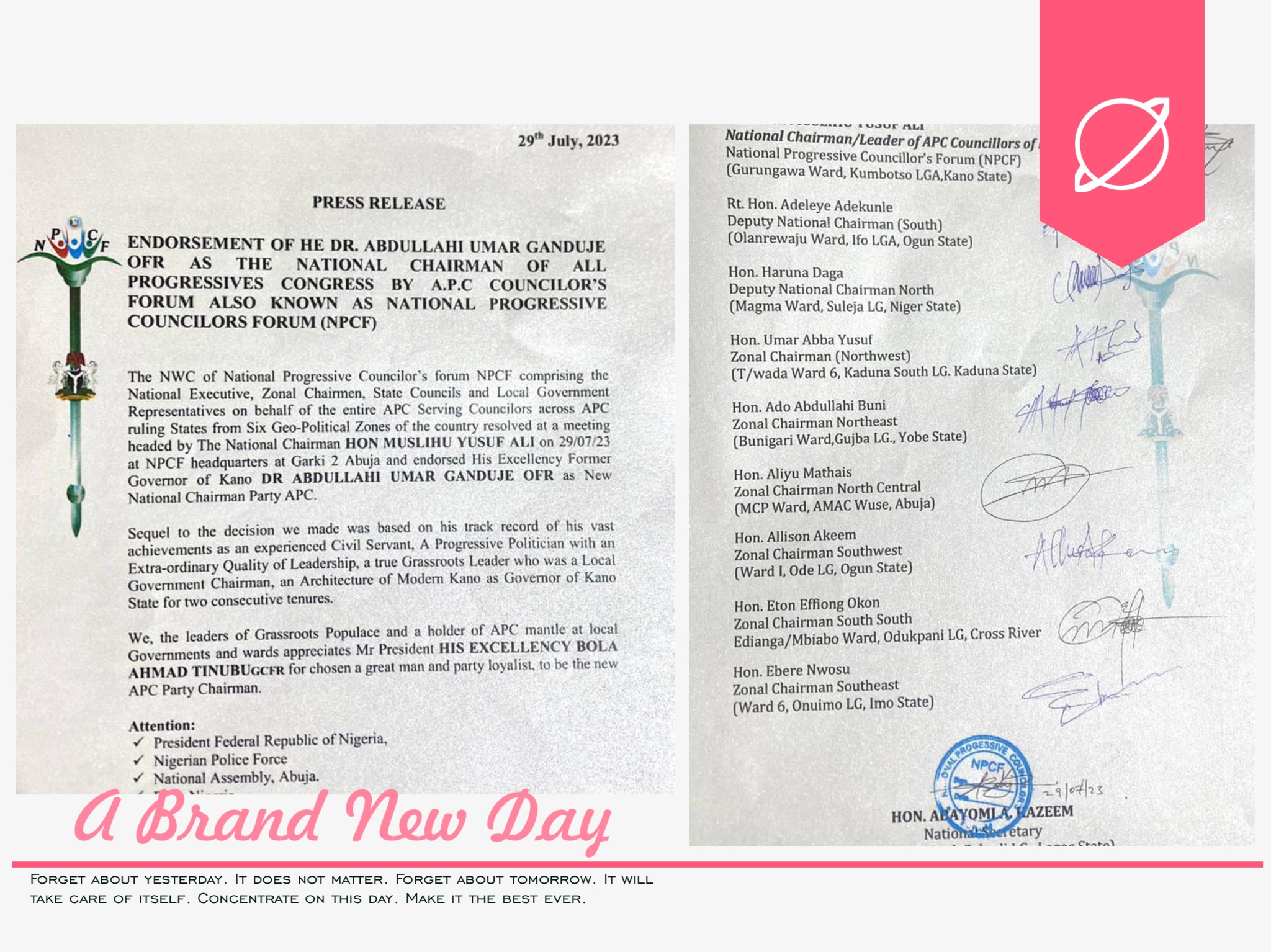 Amadadin kansilolin jamiyyar APC na kasa,karkashin jagorancin shugaban kungiyar na kasa Hon Muslihu Yusuf Ali sun goyi bayan Dr Abdullahi Umar Ganduje yazama shugaban jamiyyar APC na kasa Baki daya, duba da cancantarsa da kishinsa ga jam’iyya da kuma yadda yake da himmar ciyar da kasa gaba a kullum.